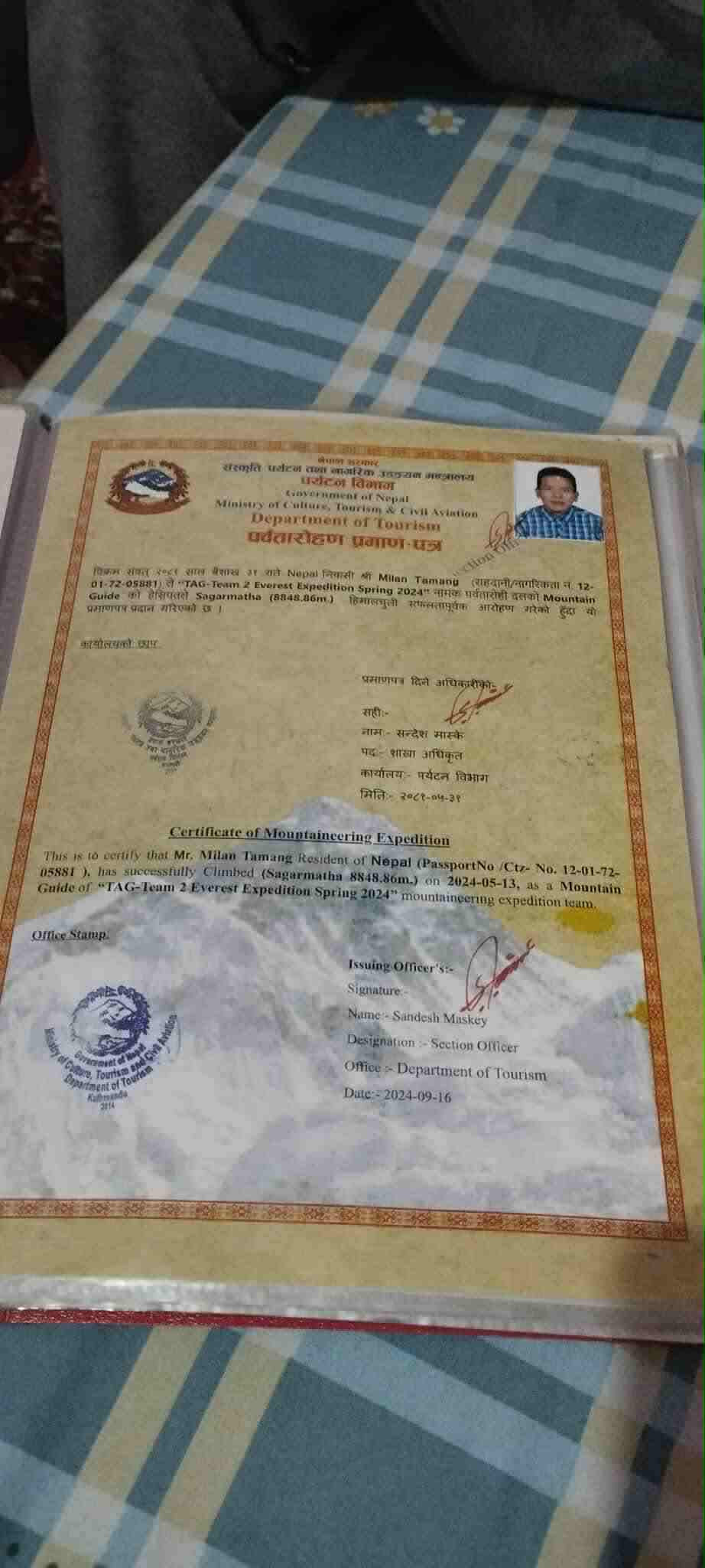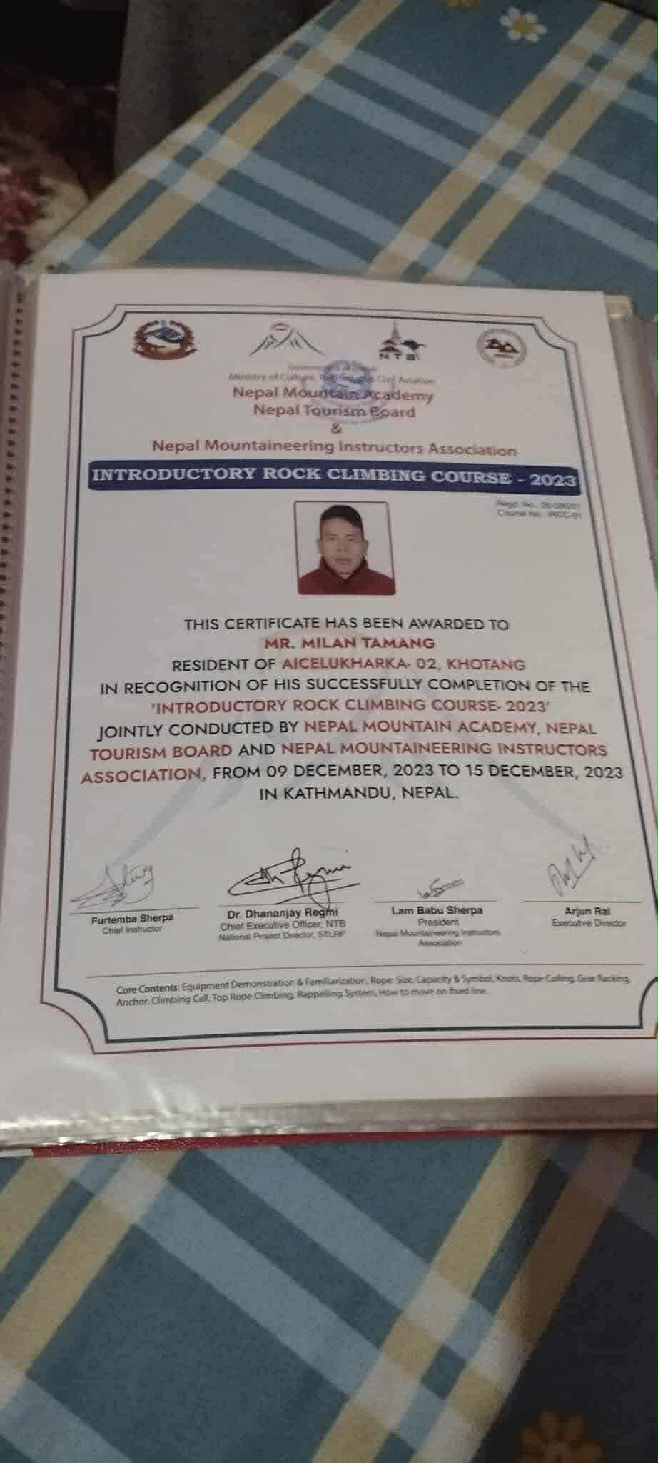 His training emphasizes not only climbing techniques but also safety management, rope systems, and guiding ethics. Milan is recognized for his dedication, discipline, and technical proficiency in high-altitude expeditions and mountaineering instruction.